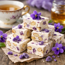 Nougat tendre au miel, subtilement parfumé à la violette. Une douceur florale, élégante et légèrement sucrée, qui fond en bouche et laisse une note délicatement rétro.tranche de 100g, 200g, 1kg au choix (prix dégressif selon le poids)