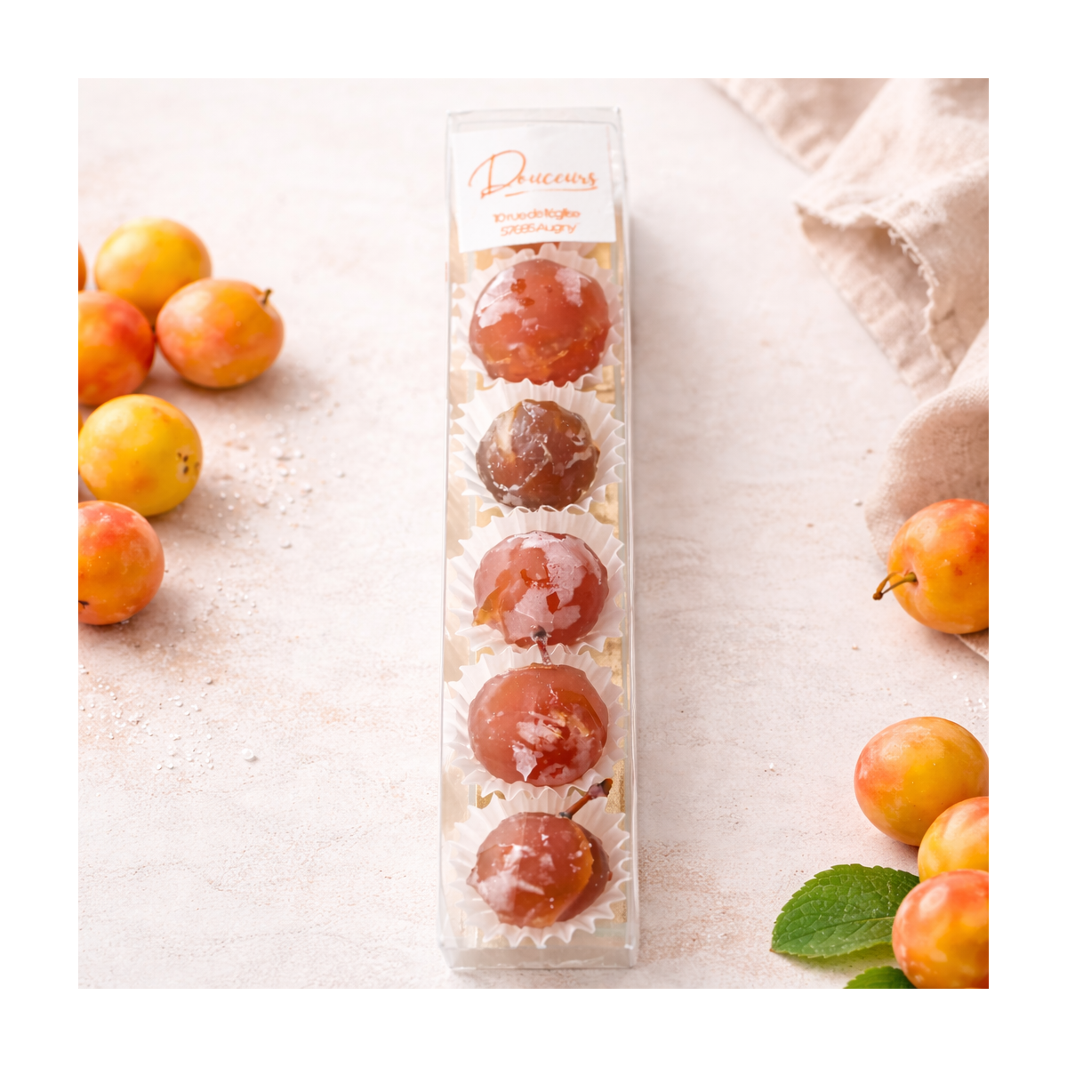 Chaque fruit est lentement confit puis délicatement glacé au sucre, une technique traditionnelle qui sublime la saveur de la mirabelle tout en lui offrant une texture fondante et légèrement croquante en surface.