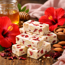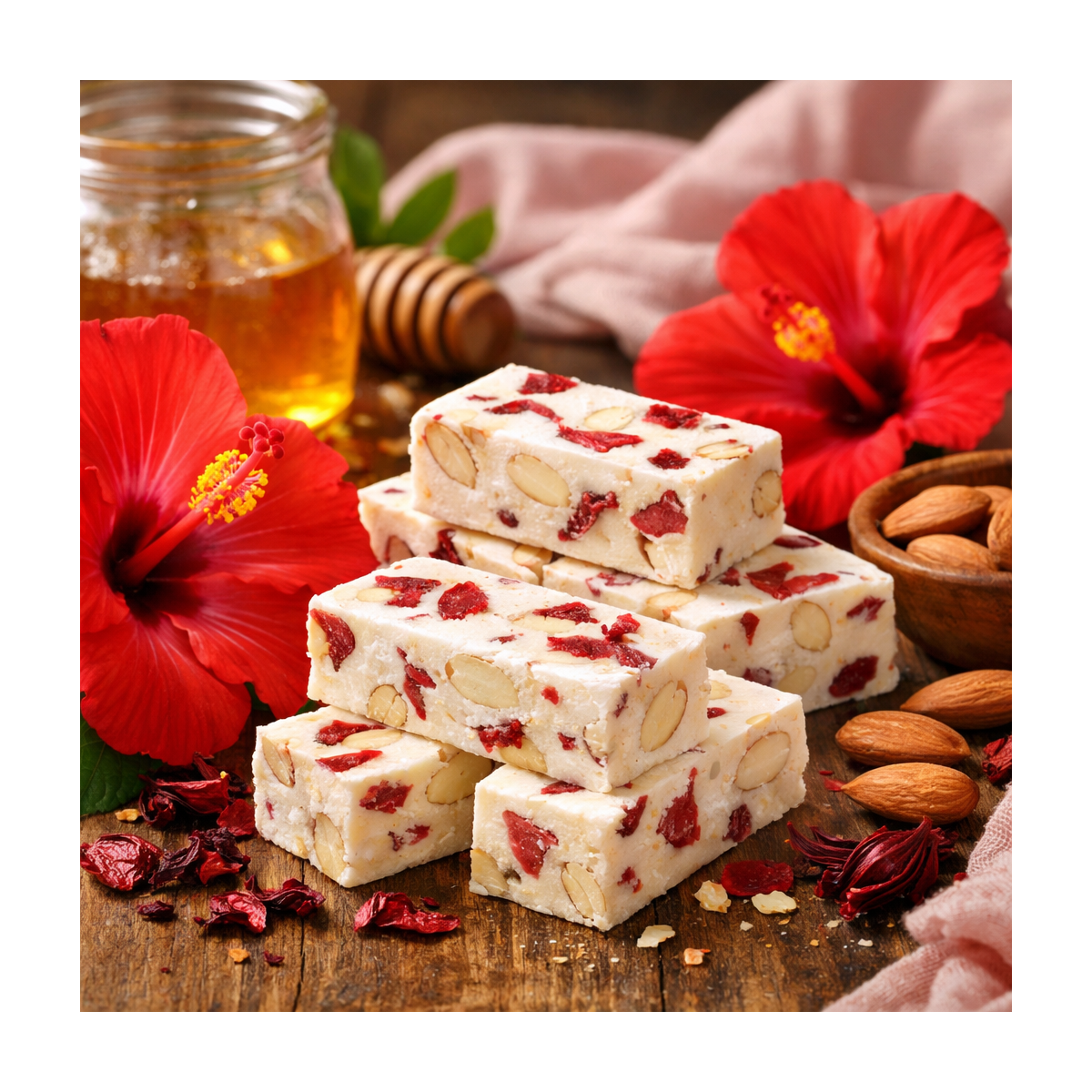 Notre nougat à l’hibiscus offre une texture tendre et fondante, sublimée par des notes florales légèrement acidulées. La douceur du miel et le croquant des amandes s’équilibrent harmonieusement avec la fraîcheur de l’hibiscus, pour une dégustation élégante et originale.